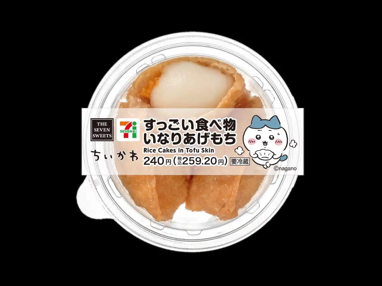 ハチワレがちいかわに「共有」したかった、すっごい食べ物の「いなりあげもち」をイメージした商品。コシのあるおもちを甘辛く煮た油揚げで包みました。 |