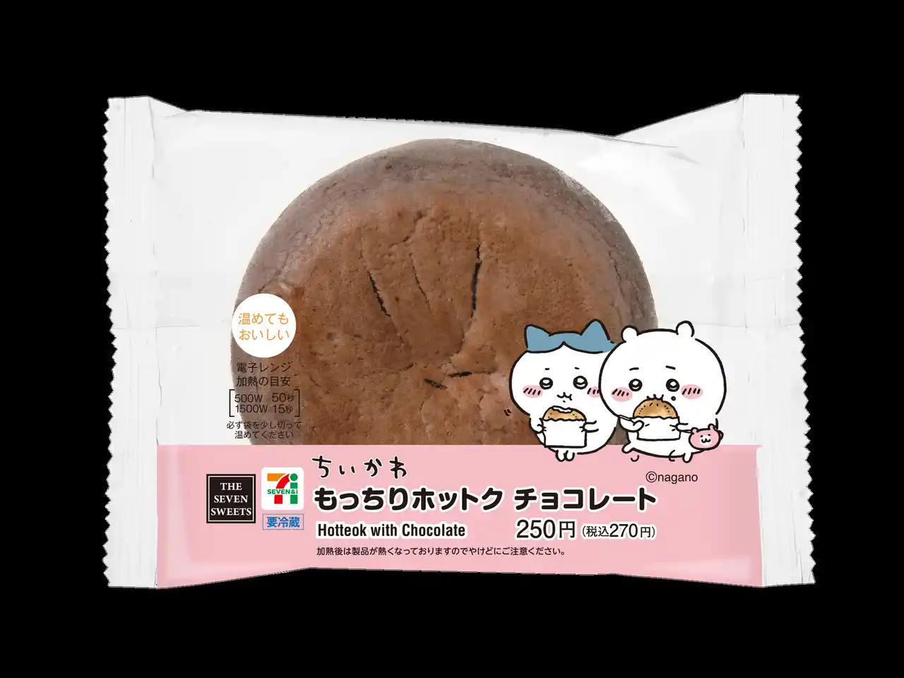 ちいかわとリボンをなくしてしまったハチワレが食べていたおやきをイメージした商品。ビターな味わいのチョコレートが入ったもちもち食感のホットクです。 |