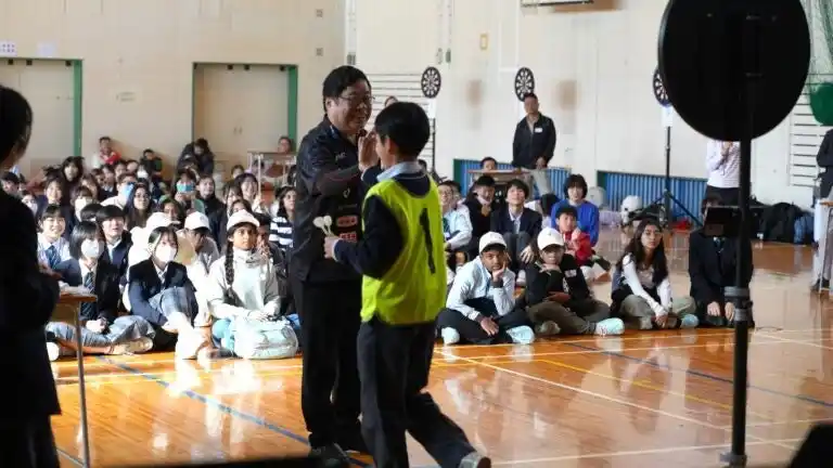 体育館に設置された10台のダーツボードには、小学低学年から大人まで幅広い年代が参加。生徒たちは「ポン!ポン!ヒュー!ブル!」と擬音を使ったリズミカルな説明で投げ方を伝え、参加者は笑顔でダーツを楽しみました。 |