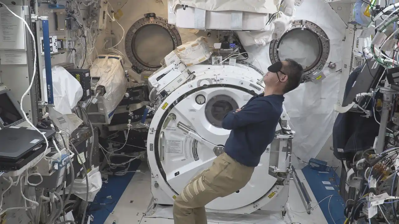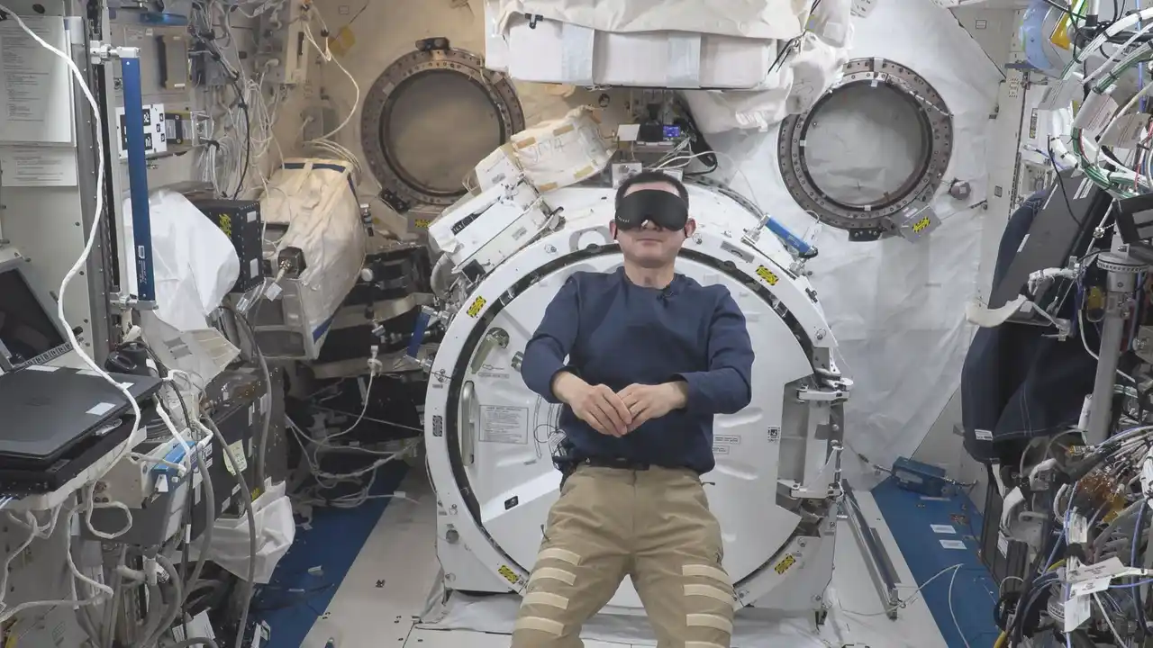 アイマスクを装着した油井宇宙飛行士 |
