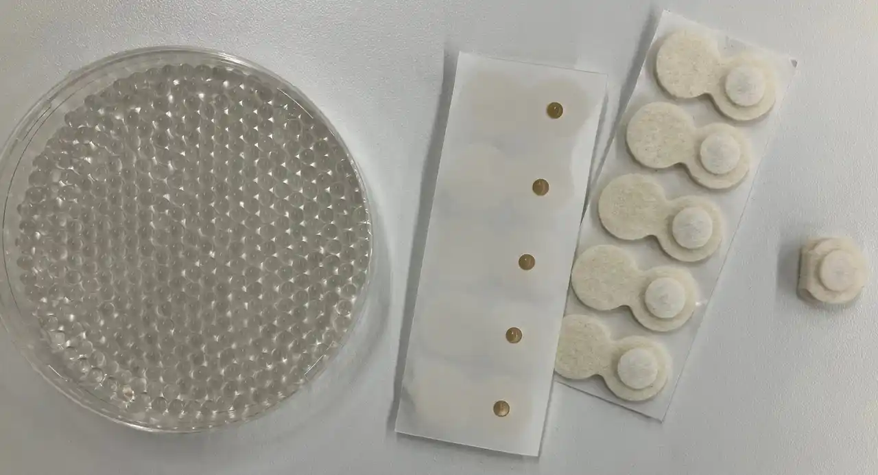 天然精油が入ったシームレスカプセルと、アイマスクに装着するための部材 |