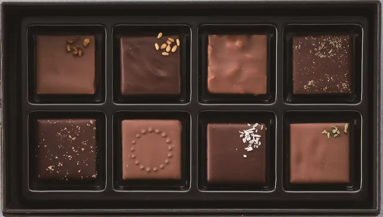 ペルー産やエクアドル産カカオ豆を使った自家製プラリネと素材の出逢い。⿊豆・⿊糖、蕎⻨すだち、ココナッツバニラなど8種をアソートしました。 |