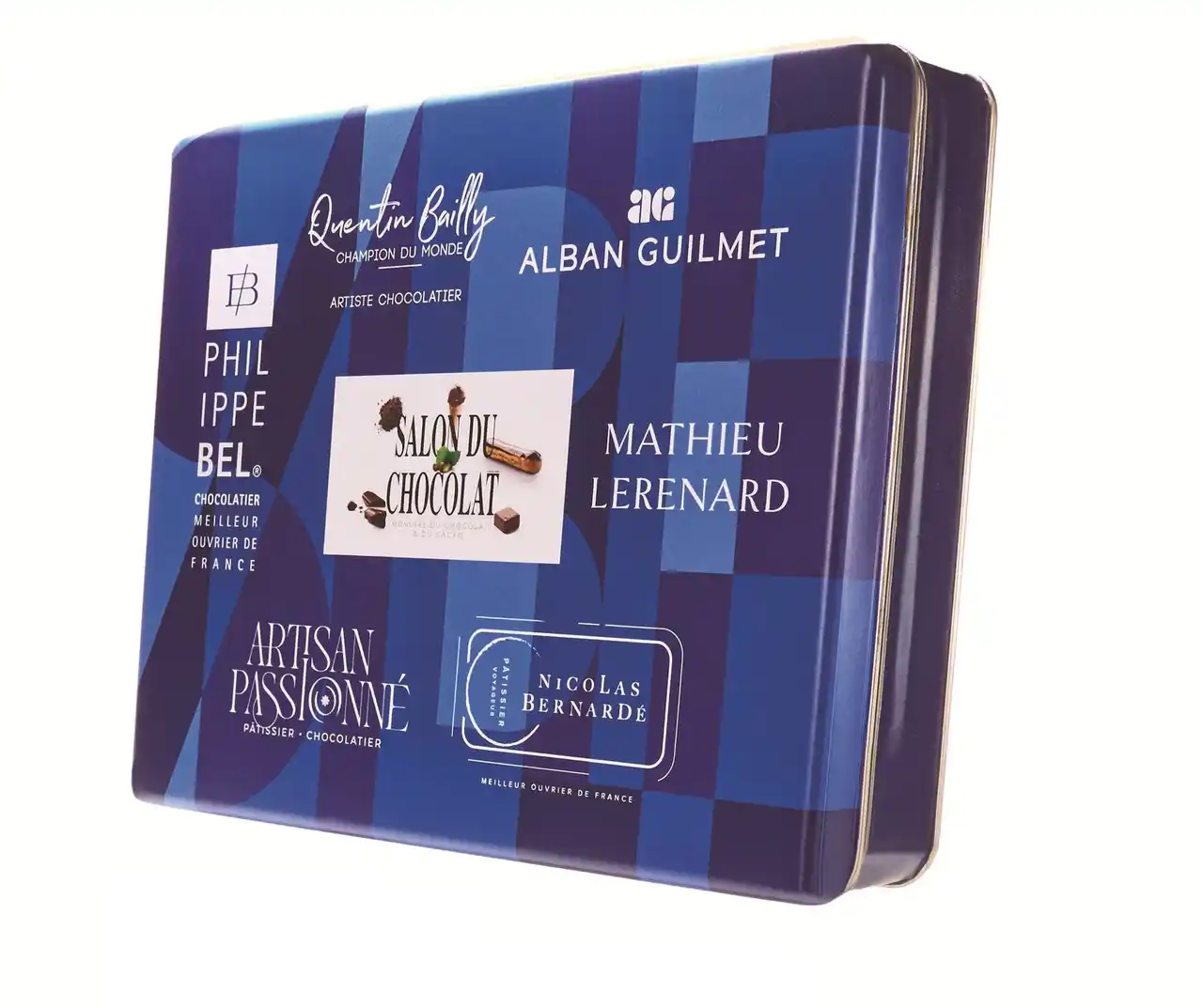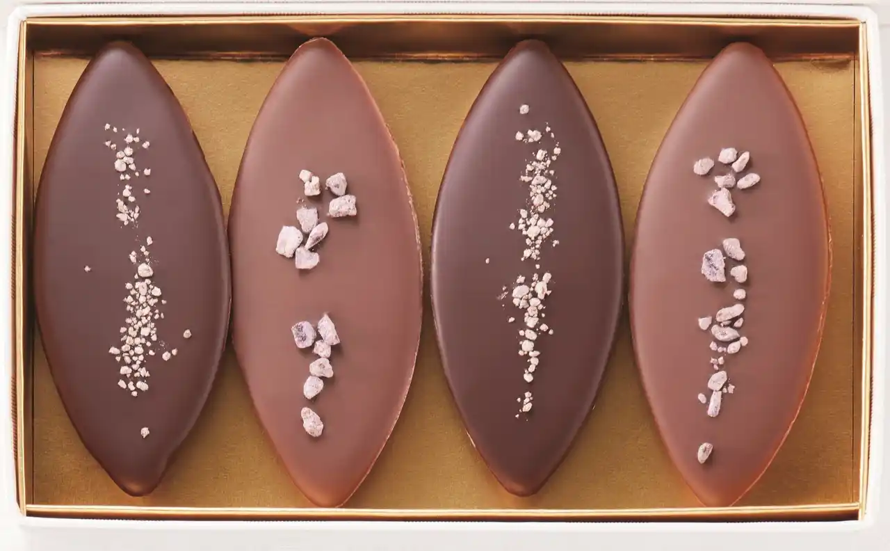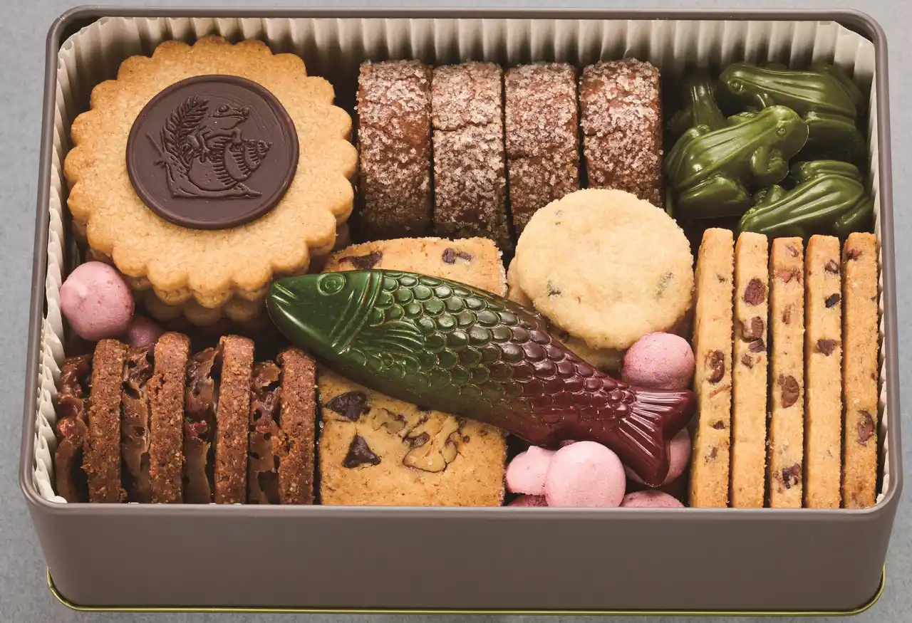 プラリネサンドやチュイルカカオ、ディアマンショコラ、ピーカンナッツ&メープルサブレ、カエル型の抹茶チョコや⿂型のプラリネも入ったブランド初のクッキー⽸です。 |