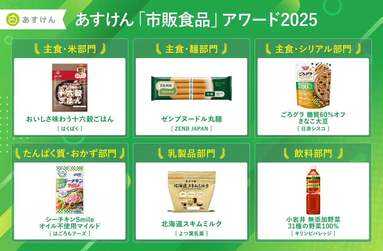 累計会員数1,300万人超・国内No.1*¹のAI食事管理アプリ『あすけん』の開発・運営を行う株式会社asken(東京都新宿区、代表取締役社長 中島洋、以下「当社」)は、全ユーザーのわずか0.4%にあたる「あすけん健康度」(※)の月間平均点数が90点以上の、特に健康意識が高いユーザー層の食事記録データに基づき、健康的な食生活を実践する上で役立つ市販食品を『あすけん「市販食品」アワード2025』として発表します。