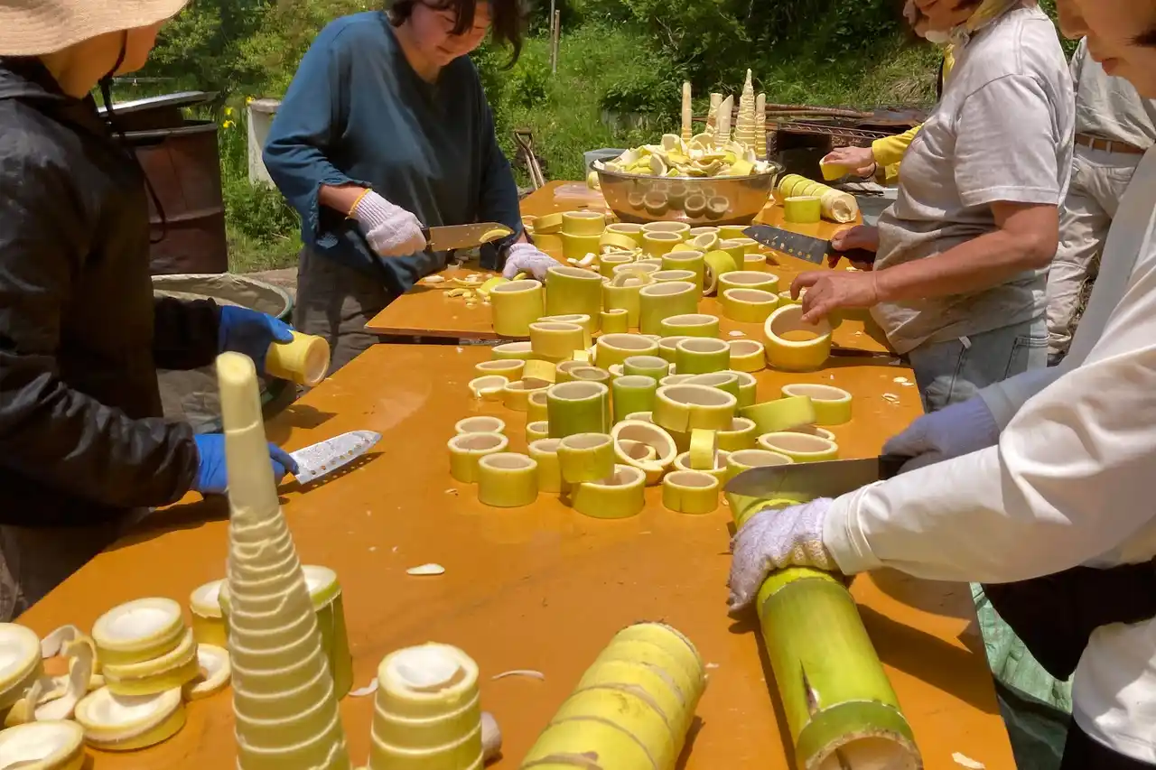 廃棄する竹を再利用することで、ゴミ処理にかかるエネルギーを減少させることができるだけでなく、竹を食物、細工、炭などに加工することで新たな価値に変えることが可能となります。 |
