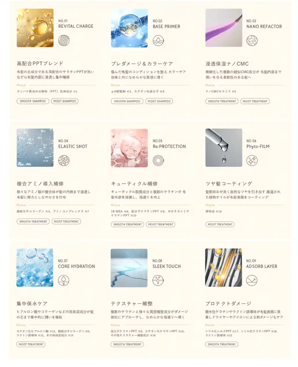 ダメージ、クセ・うねり、パサつきなど、様々な髪悩みに対しそれぞれの処方が効果・効能に応じて複合的にアプローチする新たなヘアケアシステムです。 |