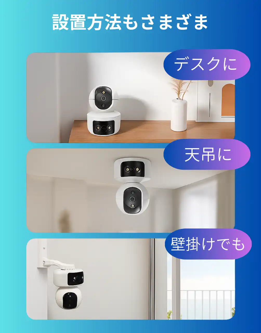 | 2つの眼でかわいい瞬間を見逃さず、子供やペット、そして部屋まるごと見守ります。 | |||