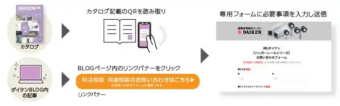 | 特注相談窓口は、専用WEBフォームからお問い合わせを受付します。これにより、ハンガーレールの特注相談や用途相談の窓口を一本化し、スムーズな対応を実現します。 | |||||||||