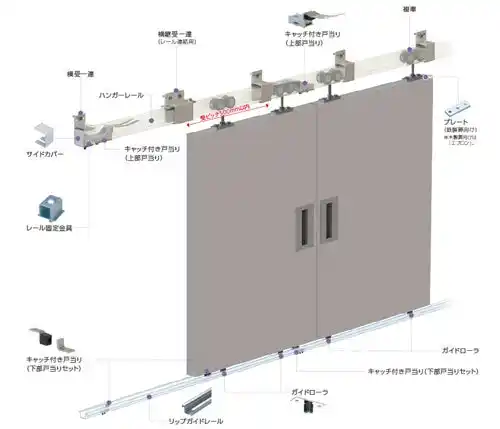 | 扉を吊るす「吊り車(複車・単車)」、吊り車の軌道となる「ハンガーレール」、ハンガーレールを天井や壁に固定する「受(ブラケット)」などで構成します。レールの材質は、スチール・ステンレス・アルミ製があります。 | |||||||||