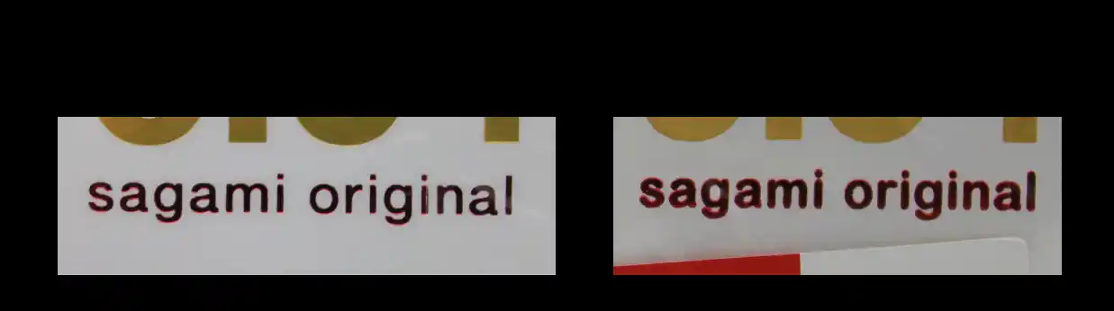 | ・箔押しされた「sagami original」ロゴが、偽物品は丸みを帯びています。 | |||