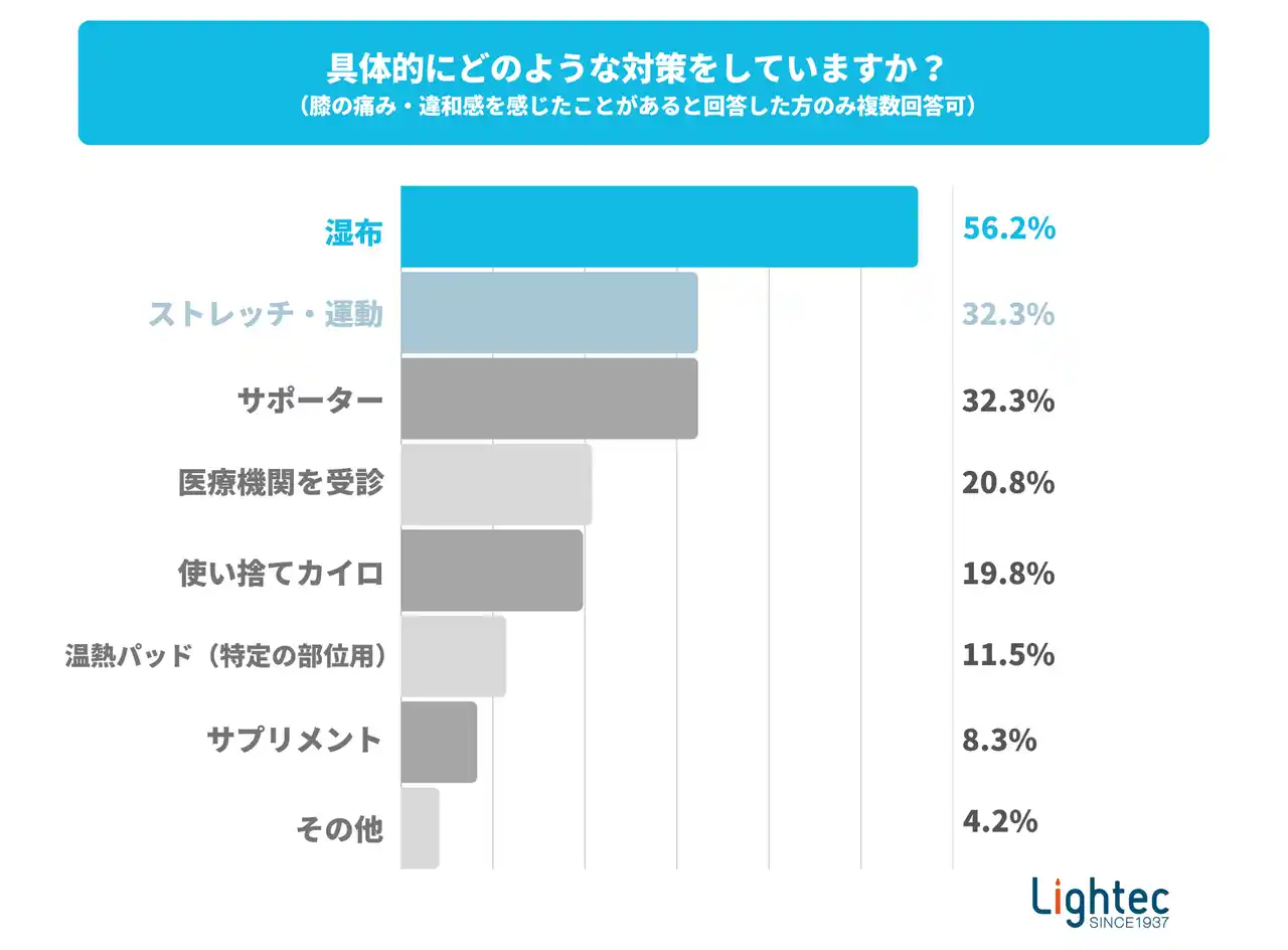 そこで具体的な対策を尋ねました。すると、「湿布」(56.2%)、「サポーター」、「ストレッチ・運動」(ともに32.3%)が上位を占めました。「医療機関を受診」(20.8%)する人も一定数おり、専門的なケアを必要とするケースも少なくないようです。また、「使い捨てカイロ」(19.8%)や「温熱パッド(特定部位用)」(11.5%)も活用されています。 |