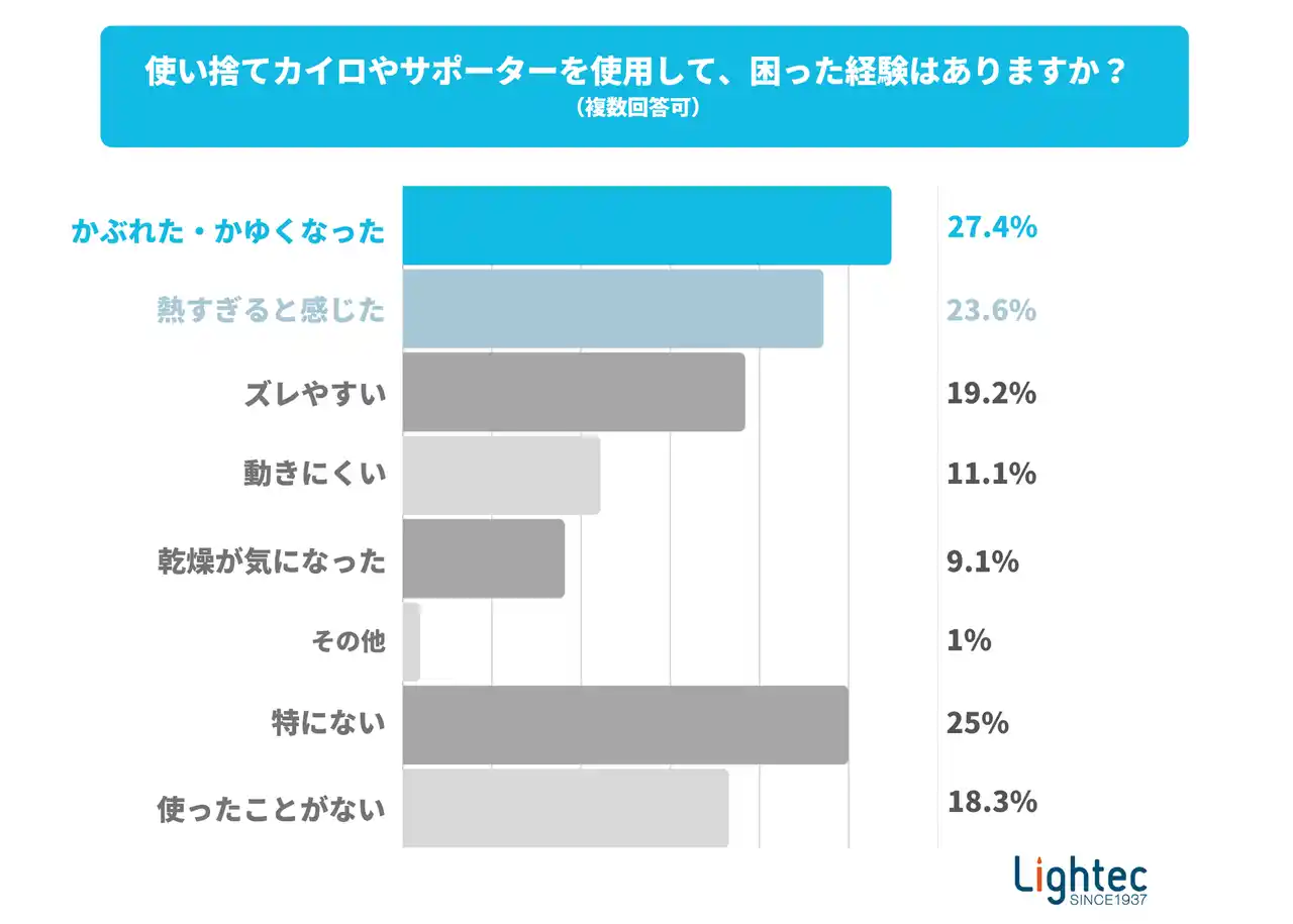 一方で、湿布や使い捨てカイロ、サポーターの使用経験がある人のうち、「かぶれた・かゆくなった」(27.4%)、「熱すぎると感じた」(23.6%)、「ズレやすい」(19.2%)といった不満が上位を占めました。これらの経験から、既存の温熱グッズに対する課題も読み取れました。 |