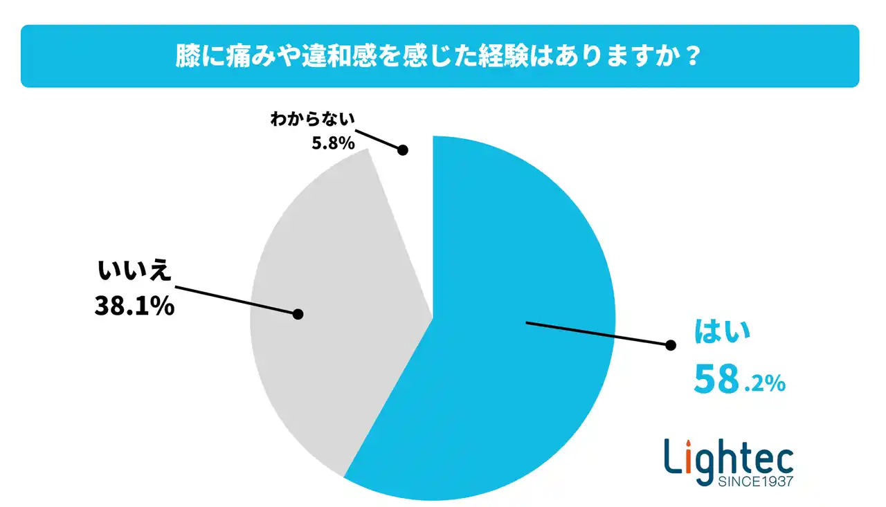 そこで、膝に痛みや違和感を感じた経験はあるか尋ねたところ、「はい」と回答した人は58.2%に及び、過半数以上が不調を経験していることが明らかになりました。 |
