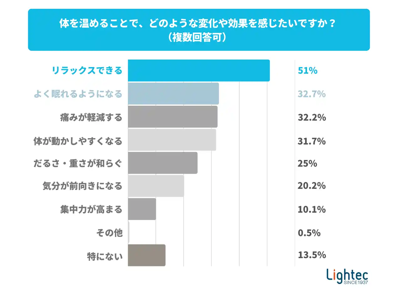 冷えを解消するために体を温めることで得たい効果として、「リラックスできる」(51%)が半数以上を占めました。次いで「よく眠れるようになる」(32.7%)、「痛みが軽減する」(32.2%)、「体が動かしやすくなる」(31.7%)といった回答が多く見られました。冷え対策には「身体的改善」だけでなく「リラックスや精神的安定」を求める人が多いことがわかります。 |