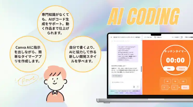 Canvaの生成AIに自然言語で指示を出しながら、簡単なタイマーアプリを完成させる90分のワークショップです。プログラミング未経験者にも分かりやすいステップで構成されており、学生から大人まで、生成AIを使ったものづくりに挑戦したい方に幅広くご参加いただけます。 |