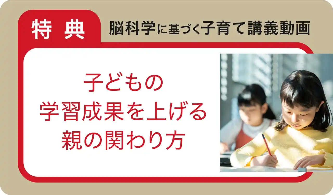 今回はより理解を深めていただけるように、脳科学に基づく子育て講義動画『子どもの宿題の成果を上げる大人の関わり方』を無料でプレゼントいたします。 |