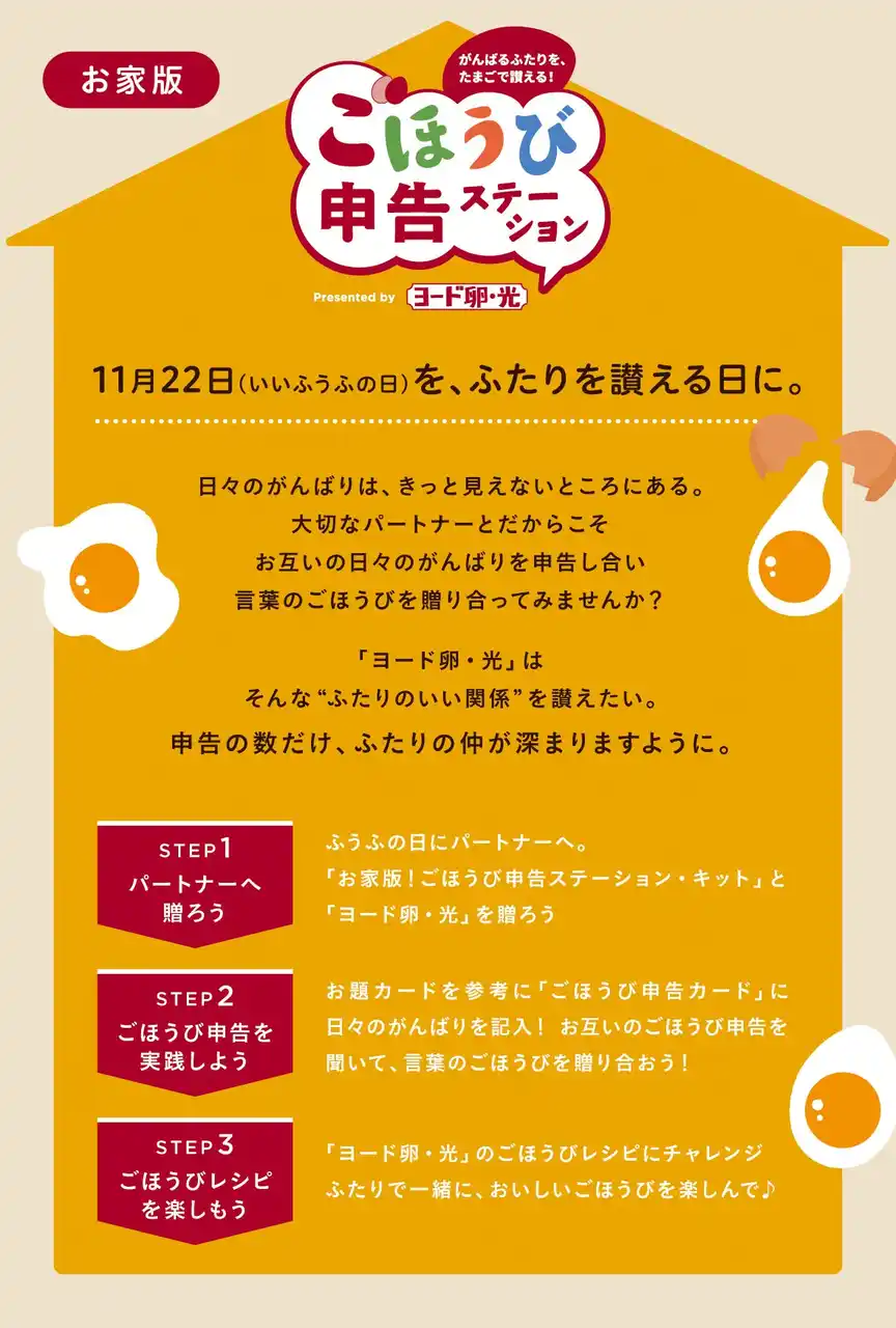 そこで『ヨード卵・光』は、 「いい夫婦の日」をきっかけに、「がんばるふたりを、たまごで讃える!」をテーマに掲げ、夫婦や恋人、家族、友人などさまざまなパートナー同士が、日頃伝えられていない想いを言葉にして交わ場をつくりました。 |