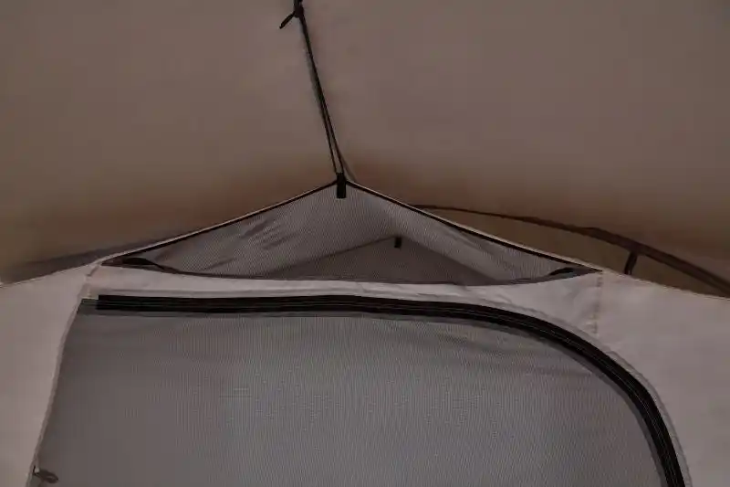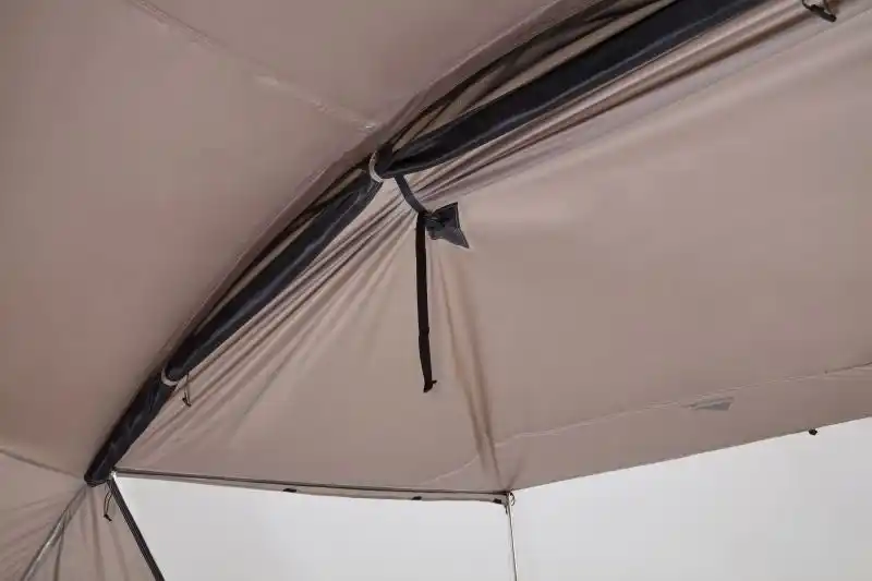巻き上げたキャノピーをさらにバックルで止めることができる「ハイビューシステム」を採用。テント内からの景色が大きく広がるだけでなく、天井の高さとリビングスペースも確保できます。 |