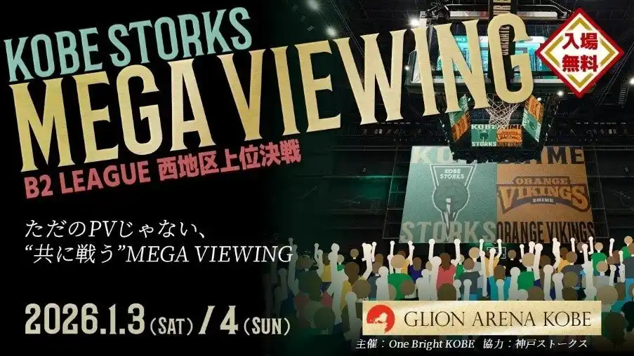 新年初戦のB.LEAGUE「神戸ストークス vs 愛媛オレンジバイキングス」のライブビューイングの同時開催が決定!試合を見たことがある人もない人も楽しめる、ホーム戦さながらの演出と一緒に白熱の試合観戦をお楽しみいただけます。 |