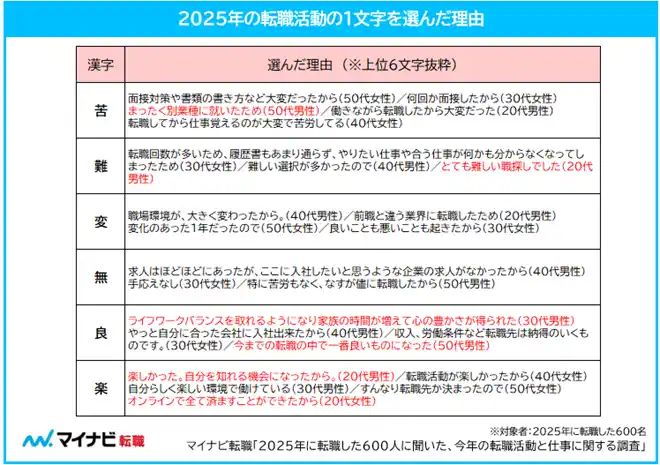 2025年の転職活動を漢字1文字で表すと年代が高いほど「苦」が多い傾向。一方、転職による成長実感や生活環境の改善などの良い変化を実感する声も。理想の面接官および職場の先輩1位は「天海祐希」