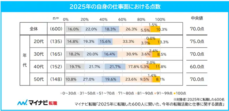 2025年の自身の仕事面を100点満点で表してもらったところ、全体の中央値は70.0点だった。 |