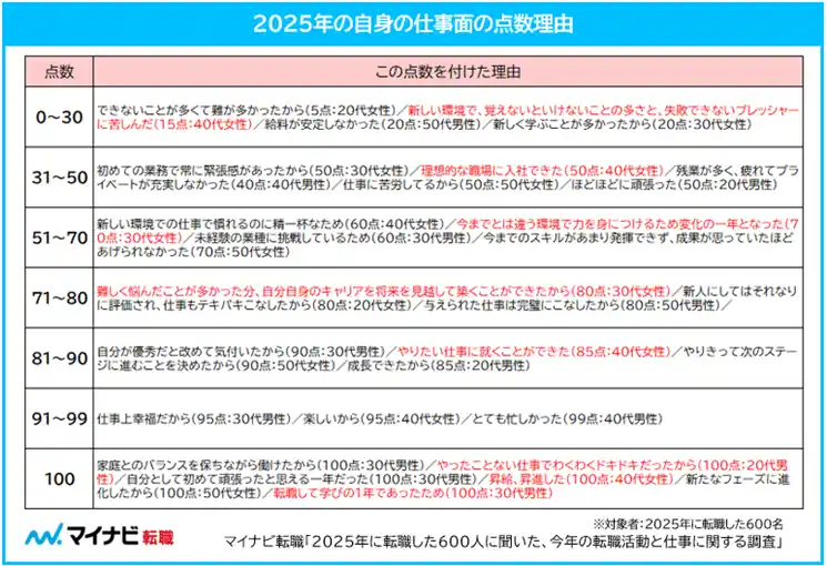 ◆2025年の自身の仕事面を100点満点で表した中央値は70.0点。「難しく悩むことが多かった分、自分自身のキャリアや将来を見越して築くことができた」という声も |