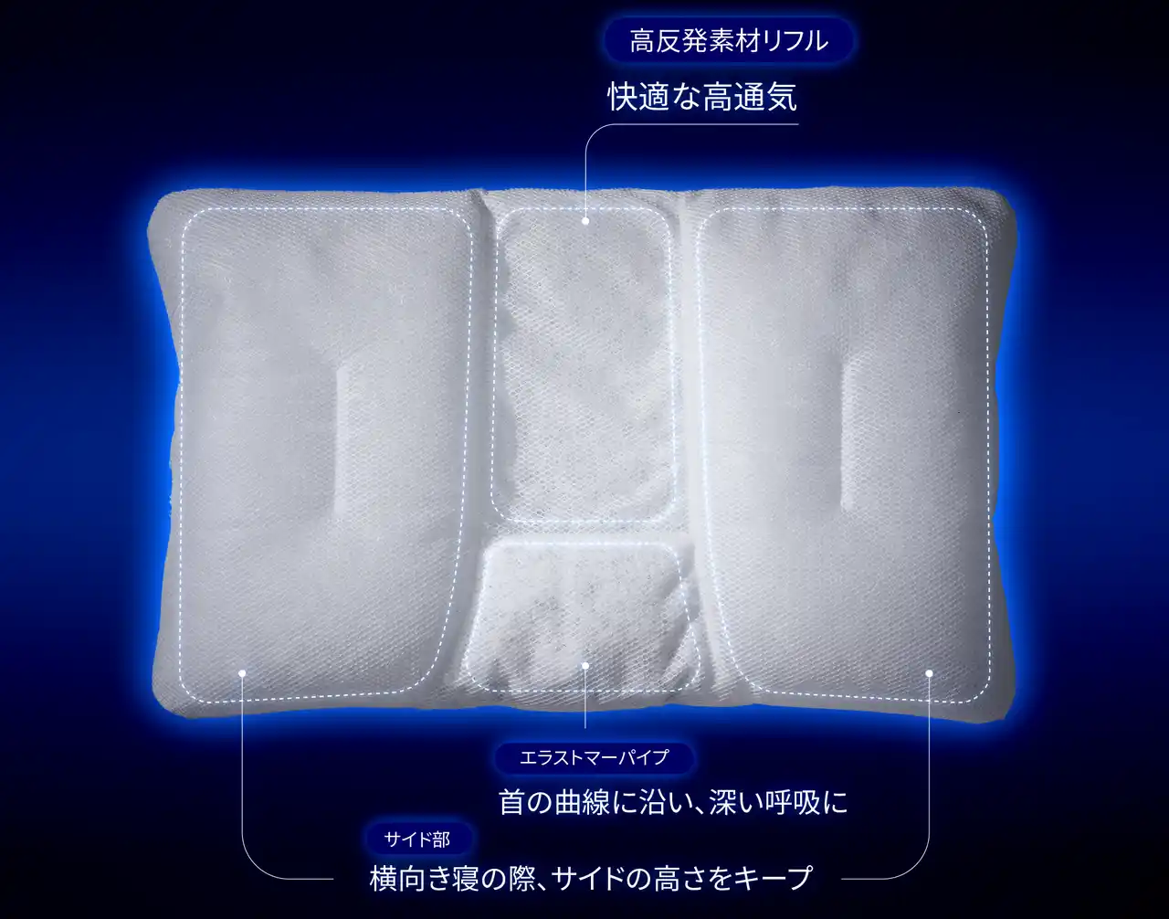 「深呼吸まくら O2」は、役割に合わせて、3つの異なる特長を持つ素材を配置しています。頭部分には通気性と耐久性に優れた独自素材『高反発網状素材リフル』を採用することでへたりにくく、蒸れを軽減します。首元には柔らかさと弾力性のある『エラストマーパイプ』を採用し、首の触感とフィット感を追求しています。その結果、頭と首への圧力負担は一般的な枕と比較して約8%軽減※4します。サイドには高通気で弾力性のある『ソフトパイプ』を採用し、あおむけ時の安定感と、横向き寝の際にも枕が沈み込みにくく、理想の寝姿勢を保てます。 |