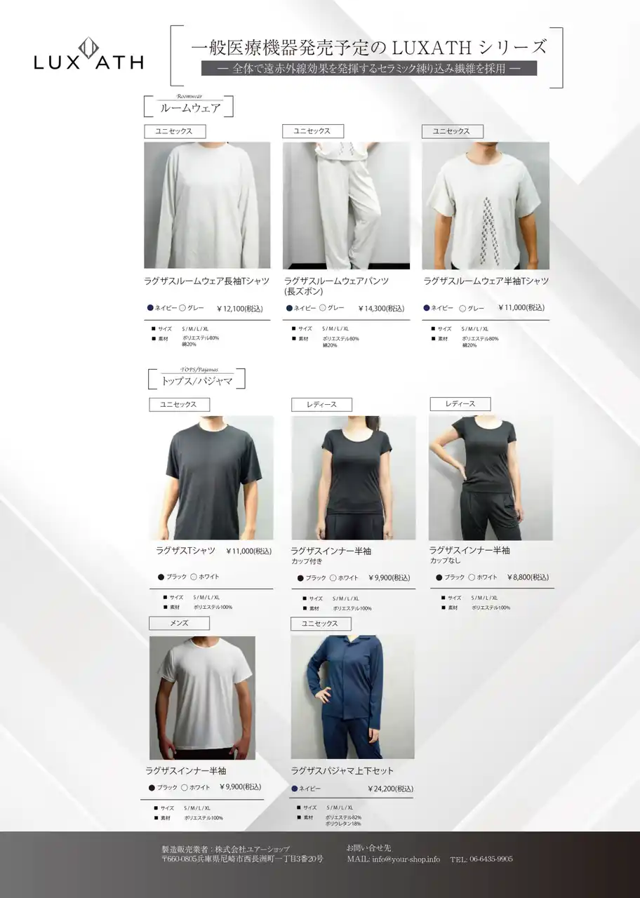 | ■「LUXATH(ラグザス)」シリーズは、弊社が開発した家庭用遠赤外線血行促進用衣”としての一般医療機器モデルです。 | |||