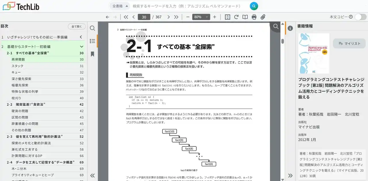| TechLib にはキーワードによる検索方法が用意され、タイトルや書籍の本文まで全文検索することで目的の書籍を探すことができます。また、お気に入りの本をリストにしたり、本文にハイライトやメモをつけて保存することができ、本文のソースコードをコピー・ペーストすることも可能(※)です。技術書籍を使った体系的な学びの場を実現し、IT エンジニアのスキルアップを力強く支援します。 | ||||||||