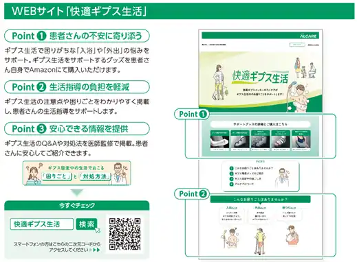 困りごとに対する細やかな対策を掲載しているので、医療従事者からギプスを装着する患者さんへ提供するサイトとしてもご活用いただけます。また、サポートグッズは患者さん自身でECサイトにて購入いただけます。 |