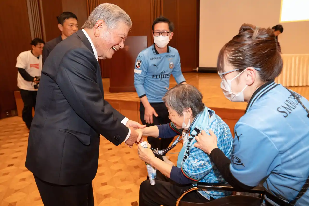 川淵三郎さんは、「サントリーウエルネス様、そして参加者の皆様、本日は本当にありがとうございました。Jリーグが目指してきた『スポーツを通じた地域社会への貢献』が、このような温かい形で具現化されていることに、感極まり涙が止まりませんでした。年齢を重ねると薄れがちな『生きがい』や『感動』を、皆様が全身で表現されている姿に、私自身が大きな勇気をいただきました。」とコメントしました。 |