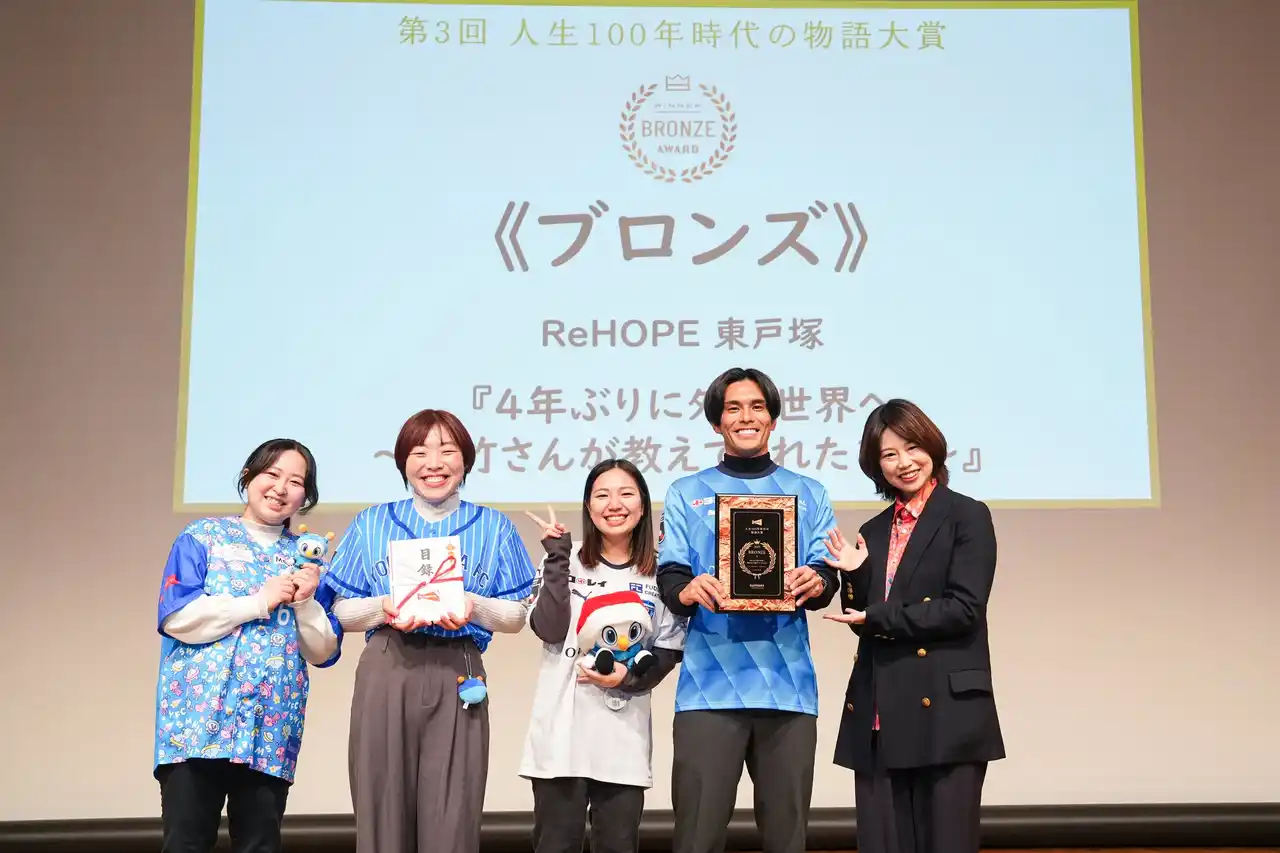 田中さんは「このたびのブロンズの受賞を大変光栄に思います。元Jリーガーである私が、サポーターの皆様や横浜FC、医療チームと連携し、4年ぶりの外出を望むご利用者様の夢を叶えられたことは、かけがえのない経験でした。残念ながらご本人は旅立たれましたが、『いくつになっても目標を持ち、人生は楽しめる』という教えは私たちの胸に刻まれています。この賞は植竹さんからの贈り物です。今後もホスピスを必要とする方々の思いに寄り添い、その人らしい時間を支えてまいります。」と受賞への思いを語りました。 |
