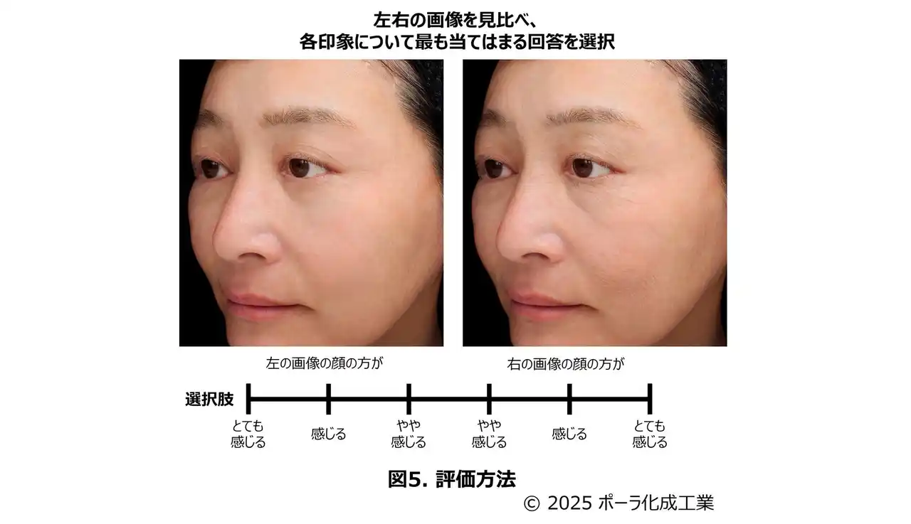 | Webアンケートにて、パソコン画面上に“散在シワあり”と“散在シワなし”の画像をペアで左右に提示し、評価項目について、「左の画像の方がとても感じる」~「右の画像の方がとても感じる」の中から最も当てはまるものを1つ選んでいただきました(図5)。 | |||