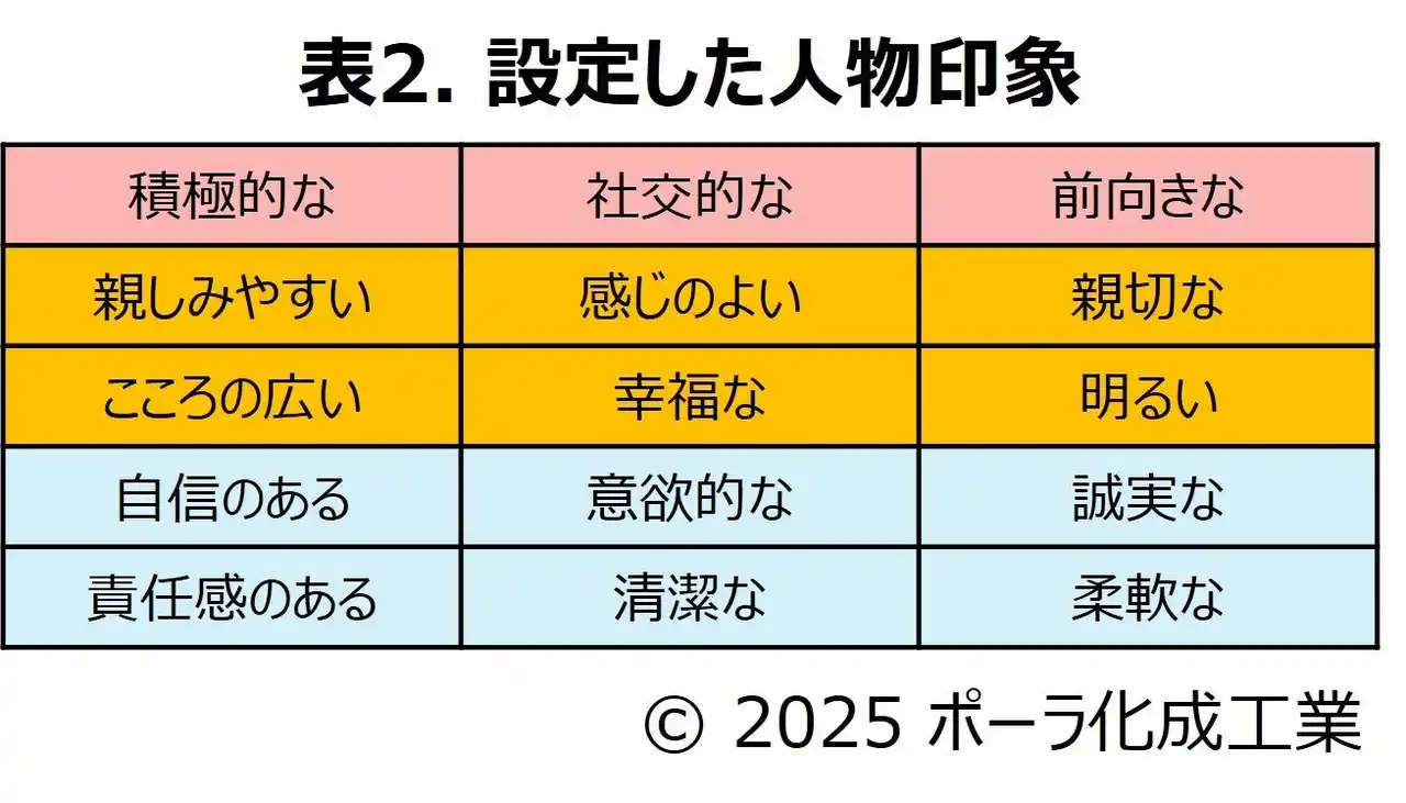 | 人物印象は、その人に対する印象を形成する判断基準(※4)の15印象を設定しました(表2)。 | |||