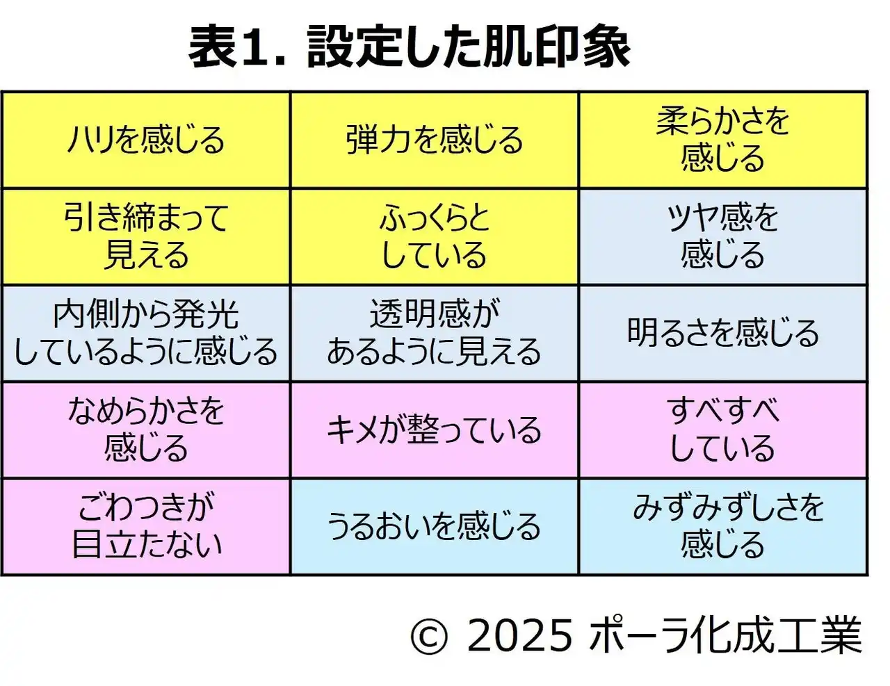 | 肌印象は、肌の弾力性、光学的特徴、肌表面状態、肌の潤いに関する15印象を設定しました(表1)。 | |||