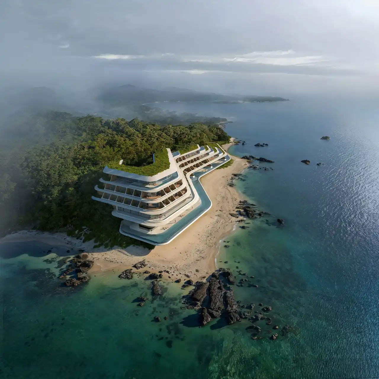 「敷地が持つ卓越した地形から着想を得た今回のデザインは、自然界に見られる地形形成の探求を通じて構成や素材にアプローチする、ZHAの継続的な研究の延長線上にあります。ホテルの段状キャノピーは、独特な海岸線の地質から熱帯雨林の豊かな植生へと柔らかくつながり、海の眺望を遮ることなく、周囲の環境との深い一体感をもたらします。同時に、プライバシーを確保することで利用者体験をより豊かにし、この地域に広がる多様な自然生態系を巡る“発見の旅”を描き出します。」 |
