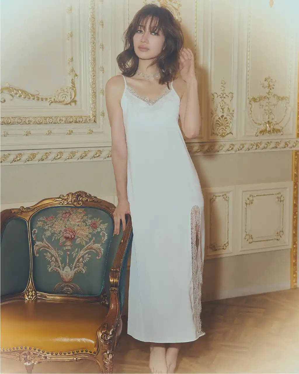 艶めくサテンに重なるアイラッシュレース。 官能を織りなすスリットワンピース。 |