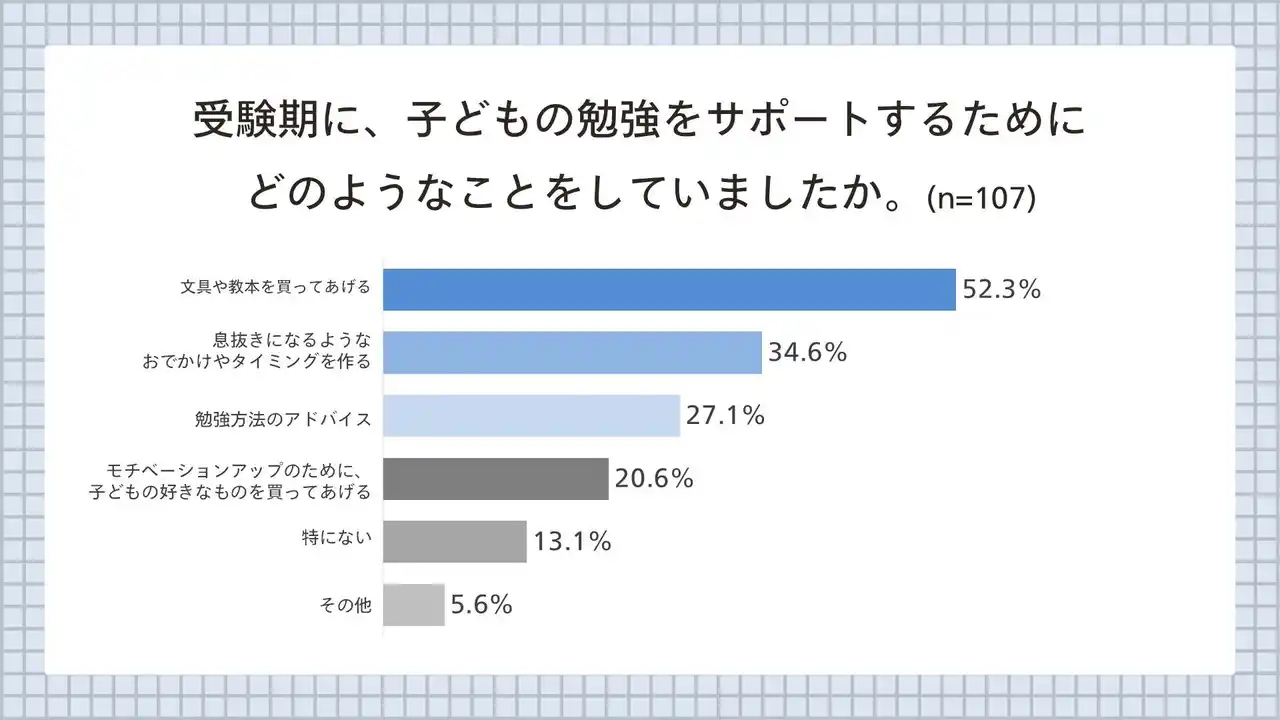 (3)コミュニケーションに加えて、「受験期にどのようなサポートをしていたか」という問いには、半数を超える52.3%が「文具や教本を買ってあげる」と回答。過去問や教本の復習や反復演習で文具の消費が多くなる受験期こそ、モノを通じて勉強をサポートしていた。 |