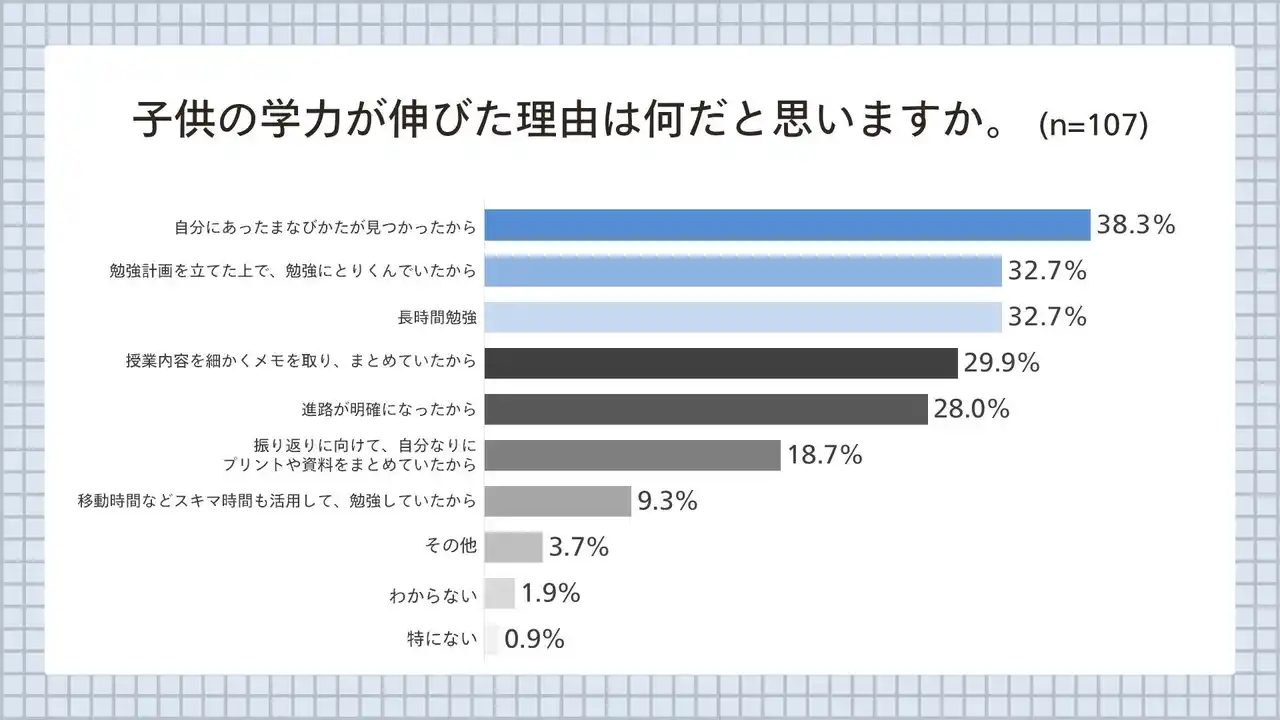 さらに、「子どもの学力が伸びた一番の理由」を聞いたところ、最多の回答は「自分にあったまなびかたが見つかったから(38.3%)」。自分にあった“まなびかた”を見つけ、楽しく勉強することが、合格につながっていることが伺えました。