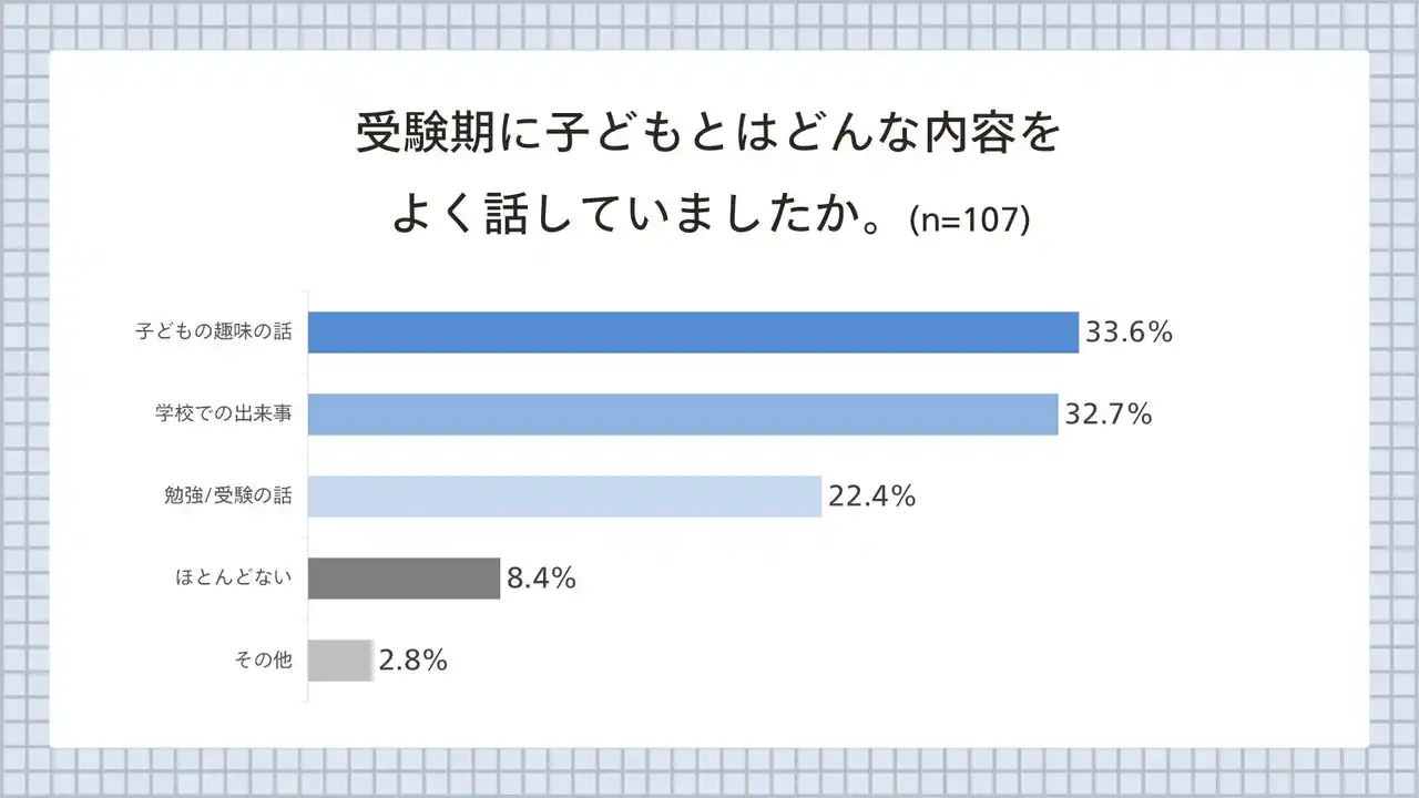 親子のコミュニケーションの実態をさぐるため、「受験期に子どもとはどんな内容をよく話していましたか」という質問をしたところ、「子どもの趣味の話」「学校での出来事」「勉強/受験の話」の順で多く、受験期でも子どもの関心ごとを話題にしていたことがわかりました。 |