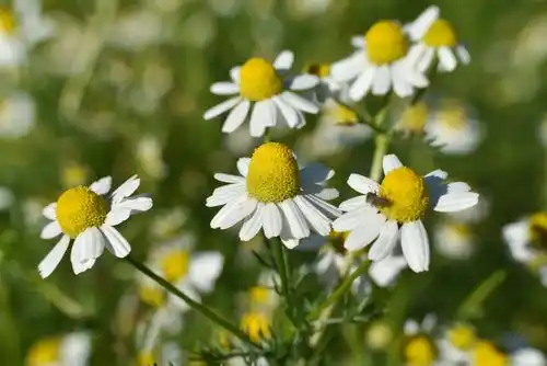 カマズレンは、特にジャーマンカモミールから抽出されたものが有名。白い花びらのジャーマンカモミールは、精油は濃い青色のため別名ブルーカモミールとも呼ばれます。 |