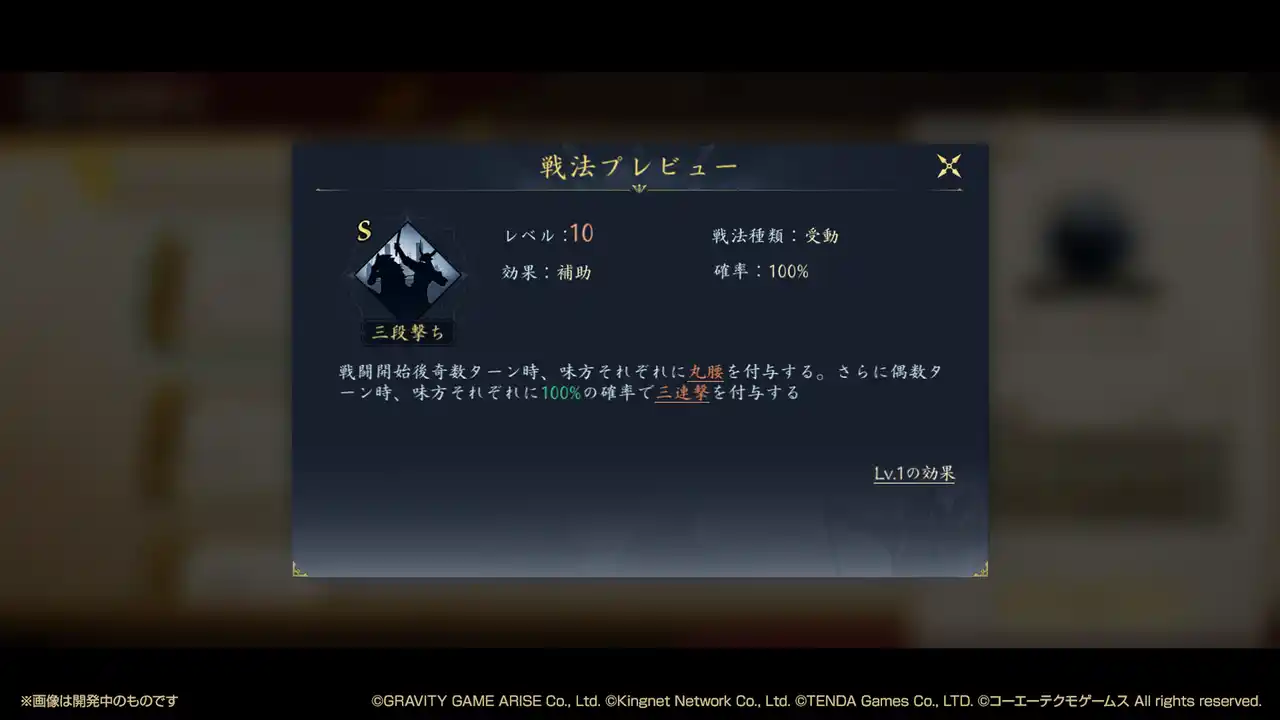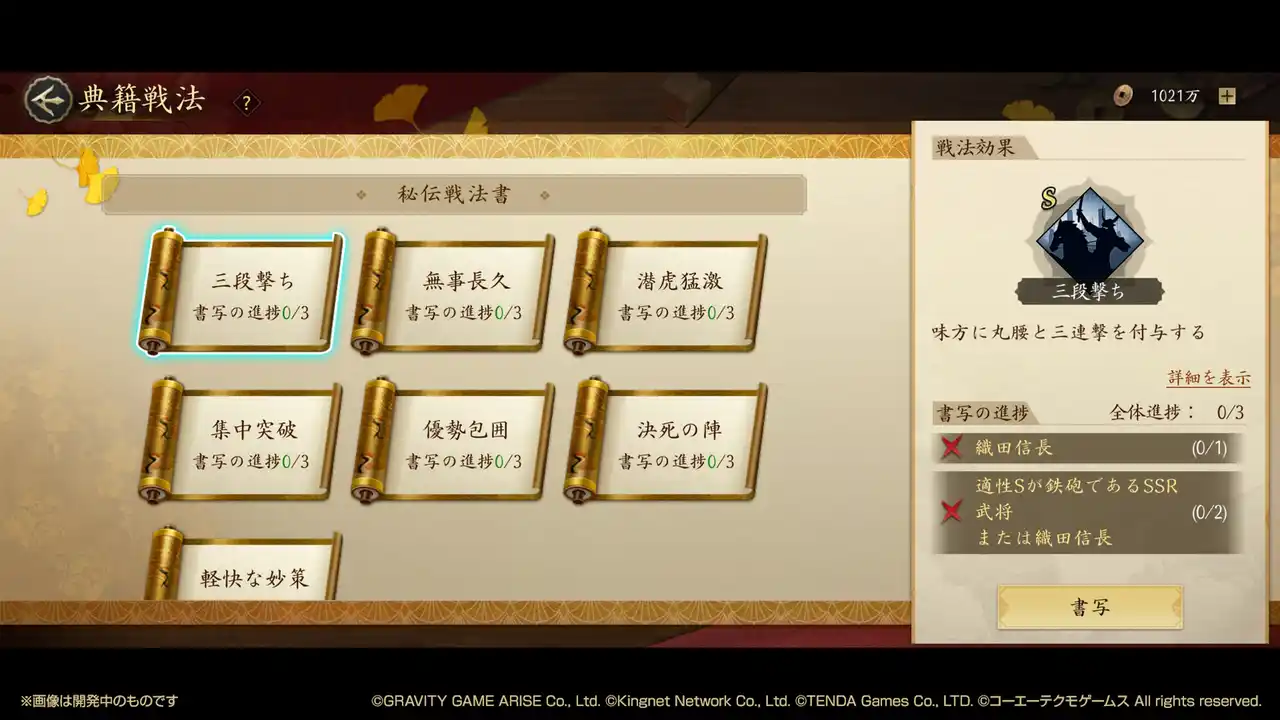 | 特定の条件を満たすSSR武将を複数消費することで獲得できる新戦法です。典籍戦法は、特定武将をイメージした強力な性能を持っており、獲得した戦法は通常の伝授戦法と同じくすべての武将に習得可能です。この新たな戦法を会得・習得することで、武将のスキル編制や編制バリエーションがより広がります。 | ||||||||||||||||||