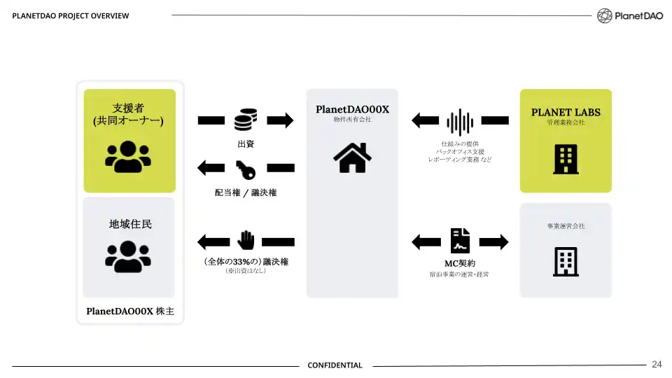 | 「PlanetDAO」は、地域住民や文化財所有者、世界中の投資家が議決権を共有する株式会社型DAO(分散型自律組織)モデルです。北條氏は、プロジェクト開始の経緯を先月9月10日の記者向け説明会にて話されました。 | ||||||||||||||||