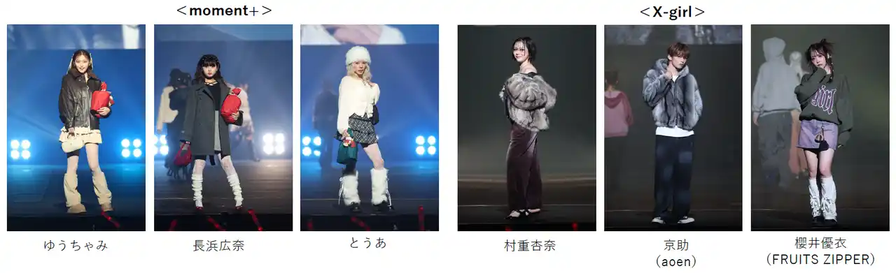 | “REAL GIRLʼS CLOTHING”をテーマに、時代の変化に寄り添いながらリアルな女の子のストリートスタイルを提案し続けるX-girl(エックスガール)のステージは、90’sストリートやグランジをテーマにNYブルックリンを彷彿とさせる演出で展開。 国民的タレントで自身初となるファッション誌のカバーが大きな話題を呼んでいる村重杏奈は、ベアトップで肩を大胆に見せたスタイルにオーバーサイズのファーコートと、ポインテッドトゥを合わせた大人ストリートな着こなしを。日本人7人組ボーイズグループaoenのメンバーで本ステージがランウェイデビューとなる京助は、グレーのファージャケット×ワイドボトムによるスタイリングで存在感を放ち、FRUITS ZIPPERの櫻井優衣は、美脚が際立つミニスカートにレッグウォーマーを合わせ、X-girlらしいストリートガーリーなムードをまとって登場しました。 | |||
