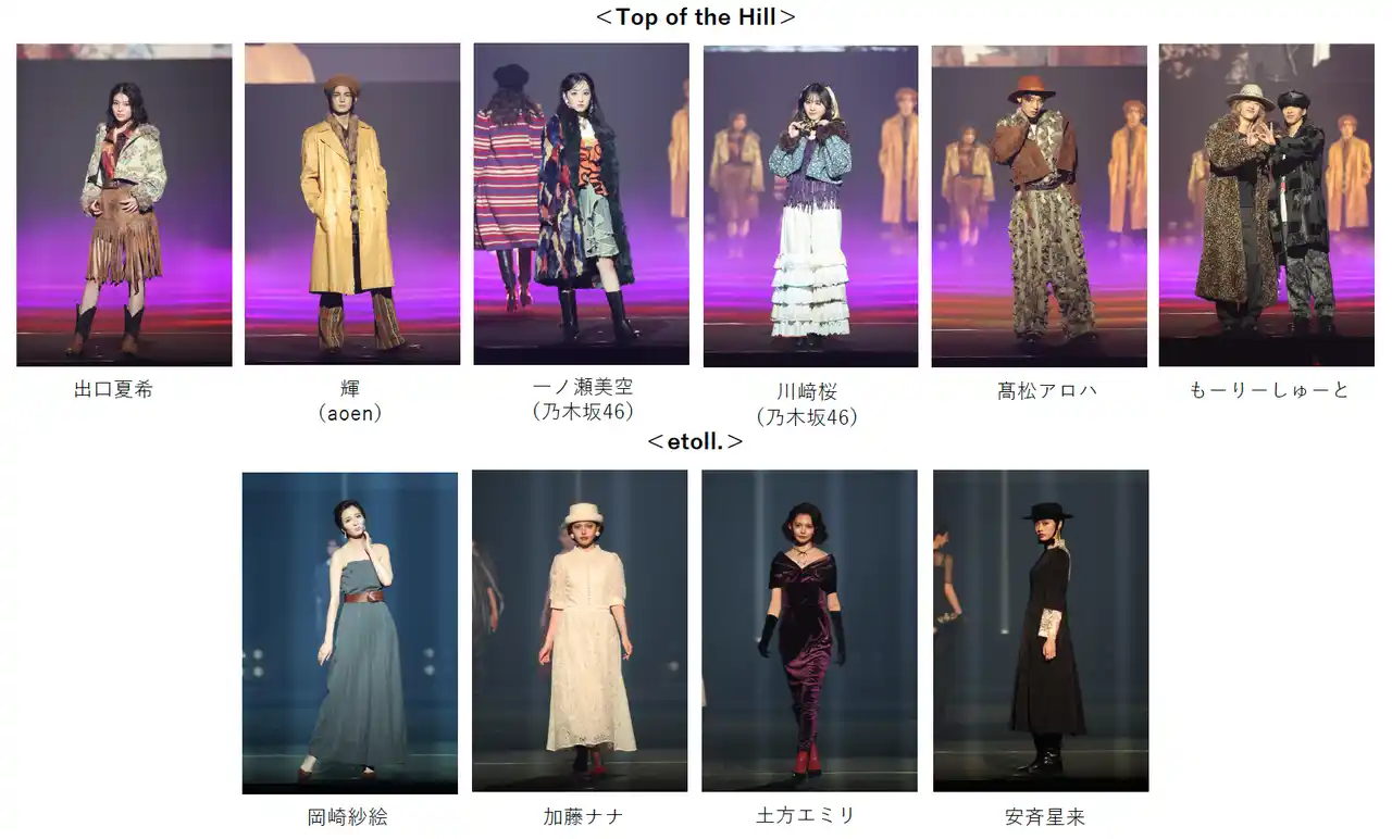 | ヨーロッパ・アメリカでバイヤーがセレクトした古着やオリジナル・インポートクローズを圧倒的な商品量で取り揃え、その時代のカルチャーを築いた上質なアイテムで新しいスタイルを提案するヴィンテージショップTop of the Hill(トップオブザヒル)によるファッションショーでは、現代のエッセンスを加えたヴィンテージルックを披露。次世代女優出口夏希がクラシカルな雰囲気が漂うウエスタンスタイルを着こなし、さらに、日本人7人組ボーイズグループaoenのメンバー輝がエレガントなスタイリングで存在感を見せました。乃木坂46からは、TGC初出演の一ノ瀬美空、川崎桜が登場し、華やかなフリルが主役となるスタイリングでランウェイを彩りました。そして、超特急のメンバー高松アロハやマルチに活躍するもーりーしゅーとがグランジテイストなルックでショーを盛り上げ、ブランドの多彩な世界観を見せつけました。 | |||