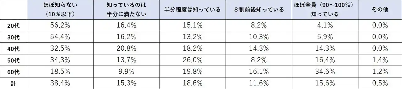 「ほぼ知らない」と回答した人が全体としては38.4%、年代が下がるほど「ほぼ知らない」の比率は高まり、20代では56.2%という結果になりました。 |