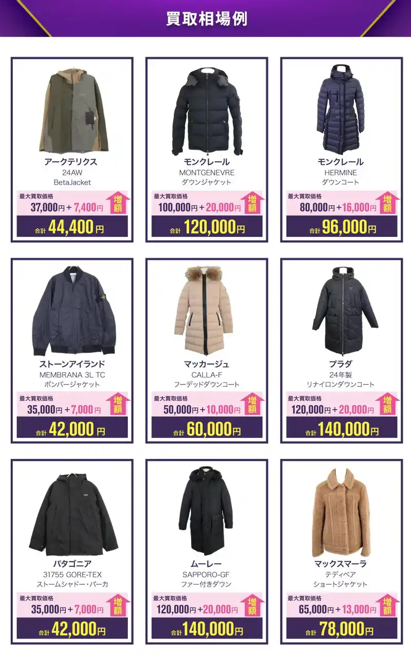 | アウター・トップス・ボトムスなど幅広いアイテムが対象となり、査定金額1点ごとに20%が加算されます。 | ||||||||||||