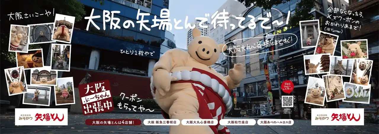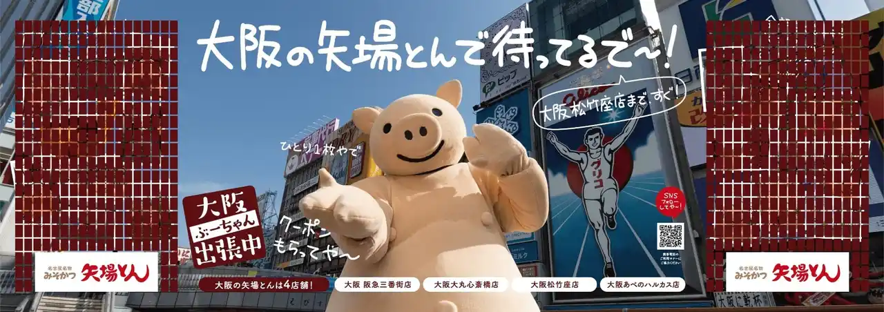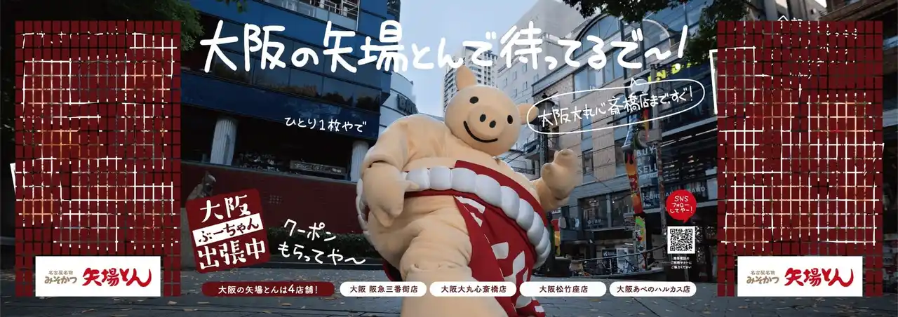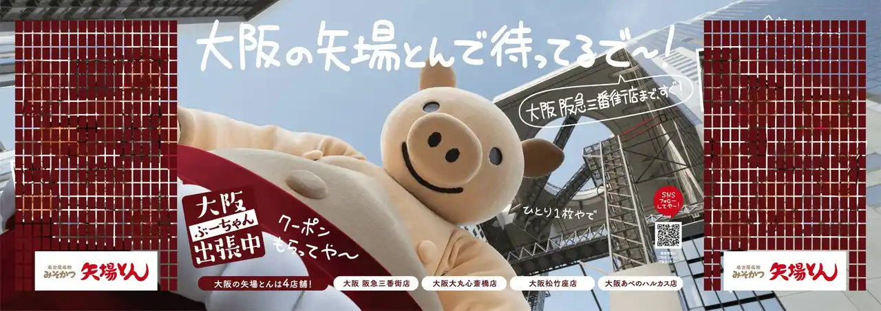 名古屋名物みそかつの「矢場とん」を展開する株式会社矢場とん(本社:愛知県名古屋市・代表取締役社長:奥村与幸)は、2025年4月に実施した「大阪にも、矢場とんあるんやで!名古屋だけちゃうで~!」プロジェクトでの反響を受け、矢場とん公式キャラクター「ぶーちゃん」が大阪に出張し、大阪の皆様へご挨拶する「ぶーちゃん大阪出張中」企画を開始いたします。 |