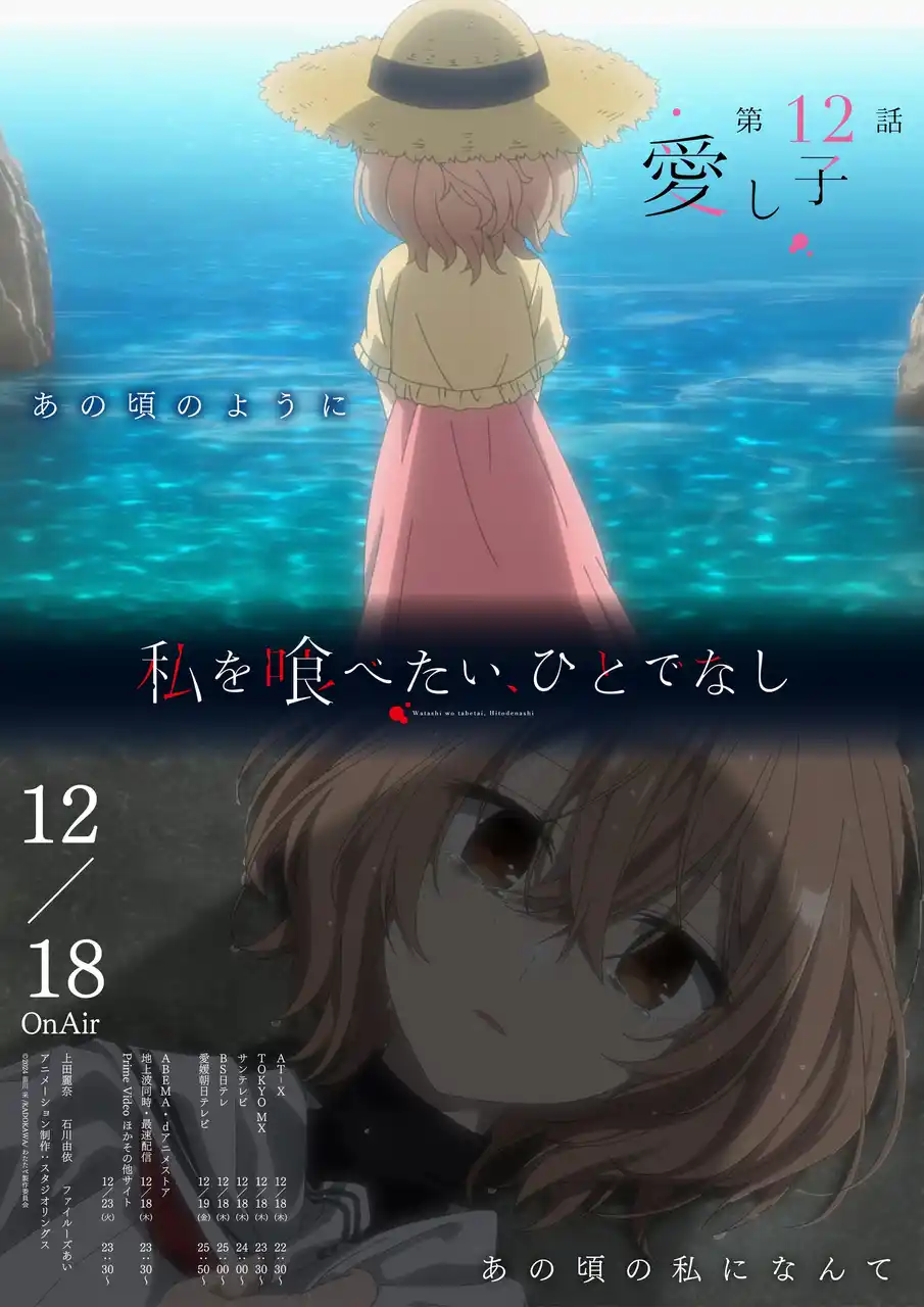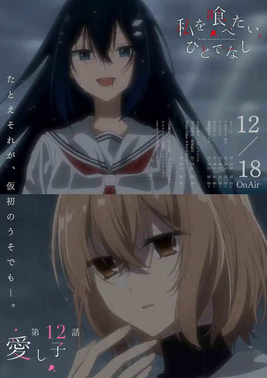 視聴者を「私を喰べたい、ひとでなし」の世界へと誘う予告映像とエモーショナルポスターは、最終第13話でも展開予定です。アニメ本編とあわせて、ぜひご注目ください。 |