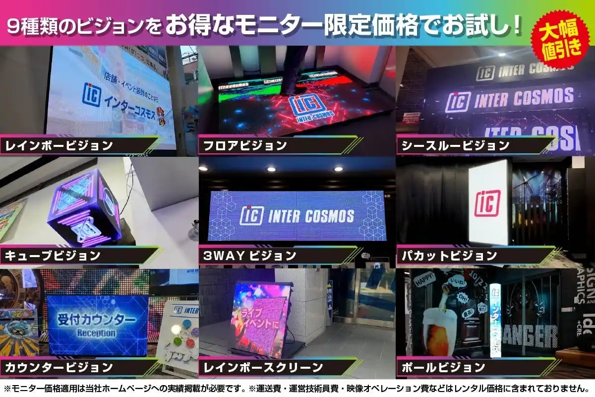 また、特別価格でご利用いただけるLEDビジョンレンタルモニターキャンペーンも継続中で、対象商品は合計9種類となりました。 |